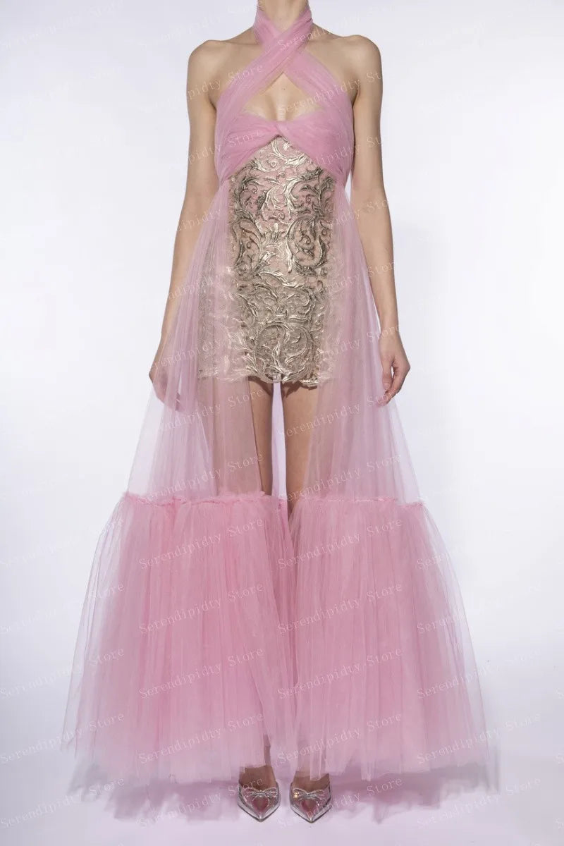 Sexy Baby Pink Halter Party Dress See Through Lace and Tulle High Low Woman Clothes Ankle Length Woman Clothes Plus Size Cocktail